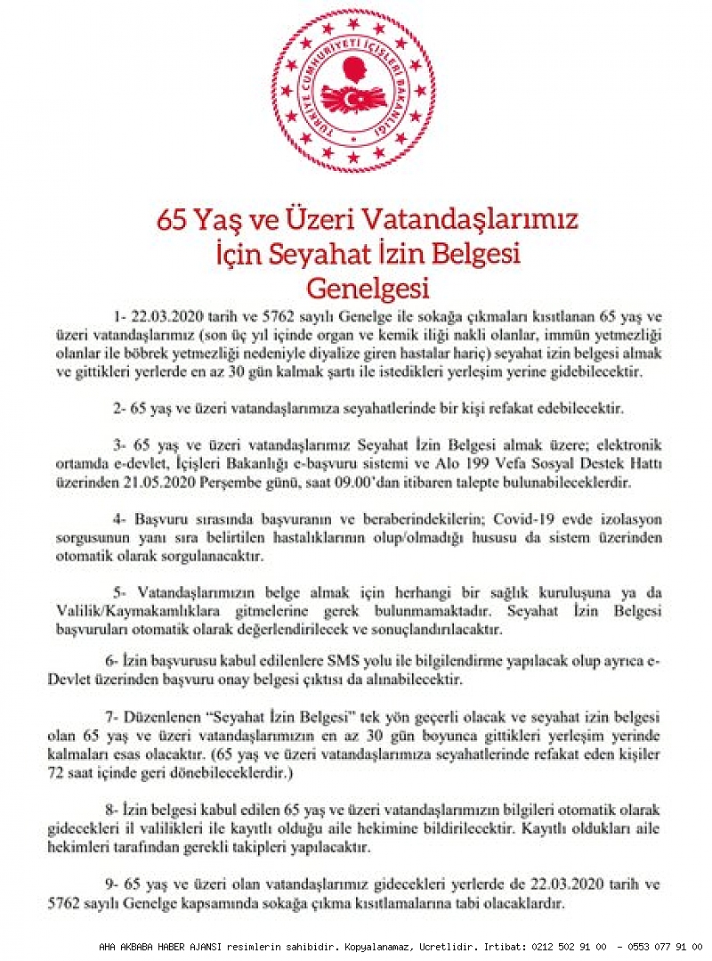 65 Yaş üstü Seyahat izin belegesi genelge içeriği